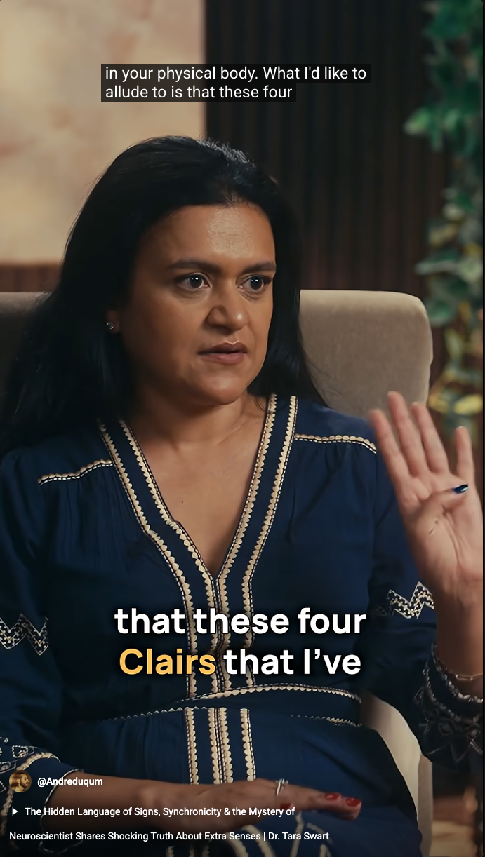 Recently I viewed a YouTube clip of Dr. Tara Swart discussing what she calls “The Four Clairs.” I previously had watched Dr. Swart’s latest appearance on Diary of A CEO podcast, where she discussed how her neuroscientific, psychiatric, and spiritual beliefs shifted following the sudden death of her husband. Dr. Swart’s tragic loss created a drive in her to do deeper research on how much we actually do not yet understand about consciousness, and how humans fit into it, use it, and are a part of it